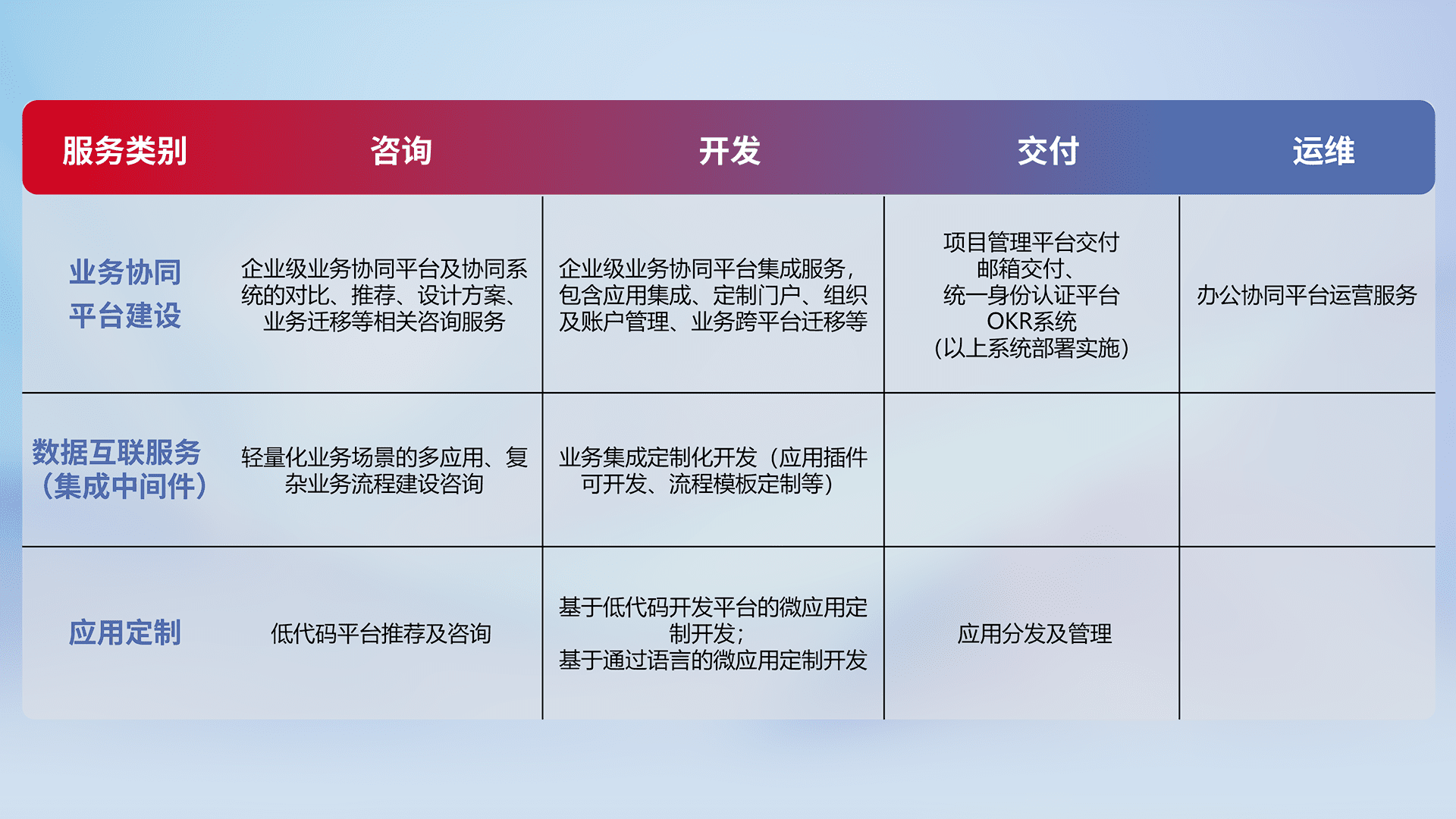 针对钉钉、、、企微、、、IDaas等平台级产品提供产品的规划、、、、方案、、、交付、、、定制化开发等服务,,实现如统一协同办公、、智能客户服务、、、混合会议管理、、、、智能数据查询、、等业务场景,,,,实现数字化转型。。
